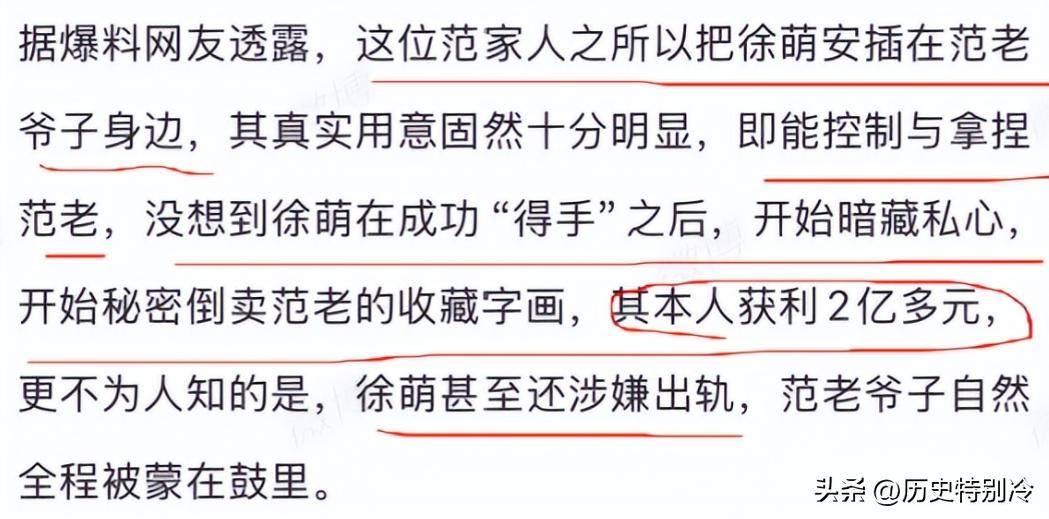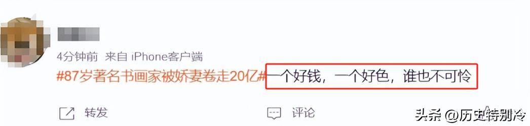 现在两人成婚才1年零4个月时间,更是中国书画巨匠,次要目标就是操纵色欲稳稳地拿捏住这个老家伙。《网友爆料:87岁出名书画家范曾被37岁老婆徐萌卷走20亿资产》
